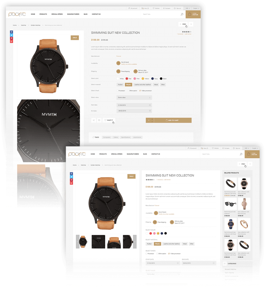 Pasifik, moda, aksesuar, ev dekorasyonu, güzellik, mücevher, sanat ve daha fazlası gibi her türlü ürün kataloğunun harika görünmesini sağlayacak çok yönlü bir temadır. Tema, eksiksiz e-ticaret işlevselliği ve en iyi alışveriş deneyimini sunmak için 15 eklentiyle birlikte gelir. Temiz ve modern tasarım, mağazanızın rakipler arasında öne çıkmasını sağlayacaktır. Tema mobil cihazlarda olağanüstü görünüyor ve cihazlar arasında geçiş yapma eğiliminde olan meşgul müşterilerin işini kolaylaştıracak. Pasifik dünyasına dalın ve ayaklarınızı yerden kesmesine izin verin!