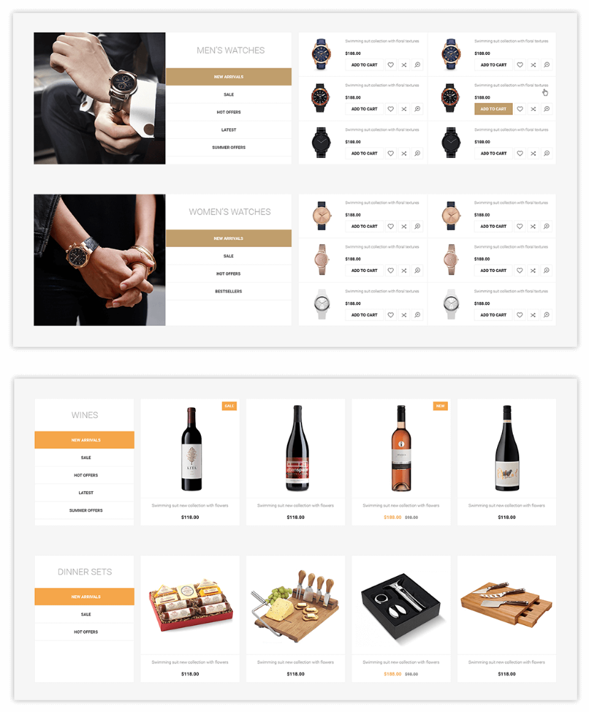 Tema, ürün kategorilerini görüntülemek için iki seçenek sunar.