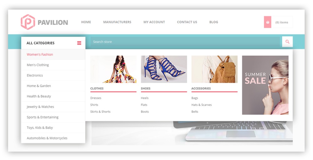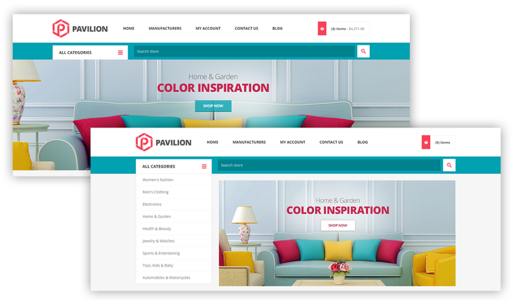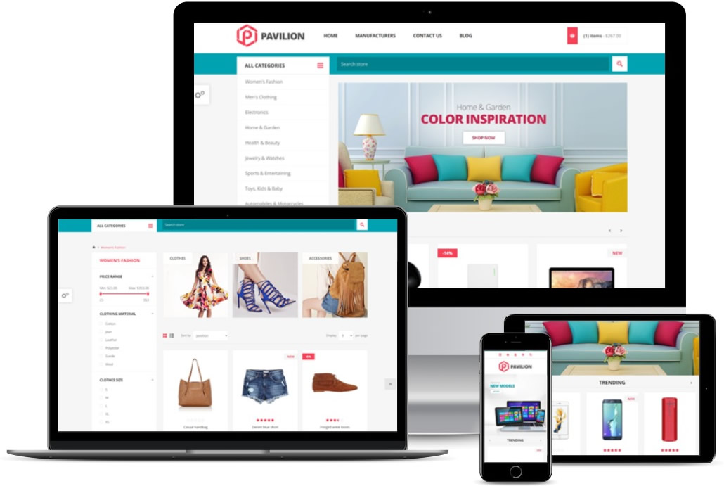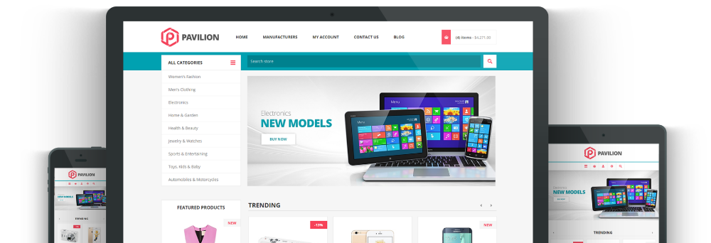Nop Pavilion Teması portföyümüzdeki mega mağaza kralıdır. Navigasyon mega menüsü, daha büyük arama ve güçlü filtreleme yetenekleri, temayı büyük katalogları yönetmek için ideal hale getiriyor. Temanın odak noktası, ürünlerinizi ana sayfada düzenleyebilme şeklinizdir. Ürün kategorilerini yeni, indirimli, öne çıkan veya en çok satanlar gibi alt kategoriler ve ürün koleksiyonlarıyla birlikte gösterme özgürlüğüne sahipsiniz. Toplam 13 eklenti, Facebook entegrasyonu ve güzel, duyarlı tasarım, nopCommerce için bu mega mağaza temasını en iyi yapan harika özelliklerin listesini tamamlıyor.