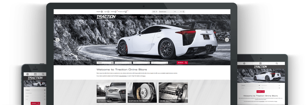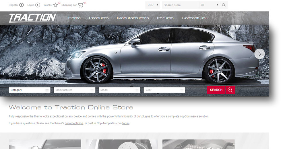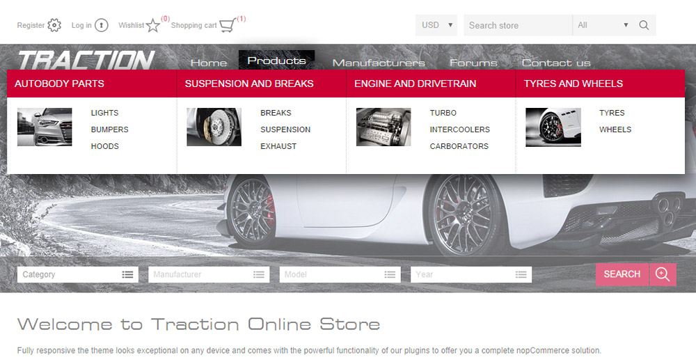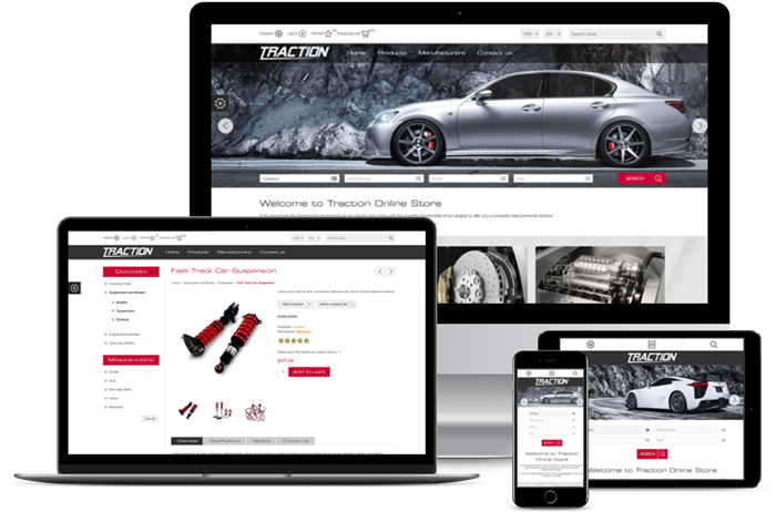 nopCommerce için Nop Traction Teması, birinci sınıf bir e-ticaret mağazası kurmak için ihtiyacınız olan her şeyi sunar. Bunun sırrı, 10 nopCommerce eklentisi tarafından sağlanan temiz, şık tasarım ve güçlü işlevselliğin birleşiminde yatmaktadır. Tema, portföyümüzde ön arama olanağı sunan ana sayfa filtrelerine sahip ilk temadır. Otomobil parçaları, otomobil satıcıları, gadget'lar ve elektronik mağazaları için uygundur.
